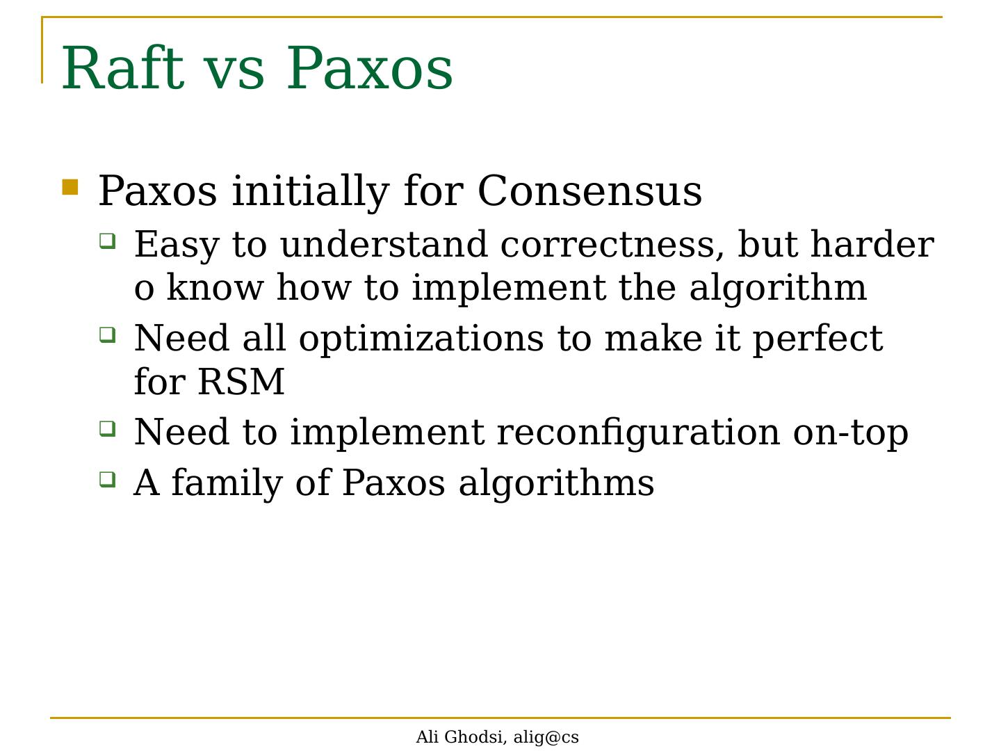 26 .Raft vs Paxos Paxos initially for Consensus Easy to understand correctness, but harder o know how to implement the algorithm Need all optimizations to make it perfect for RSM Need to implement reconfiguration on-top A family of Paxos algorithms Ali Ghodsi, alig@cs