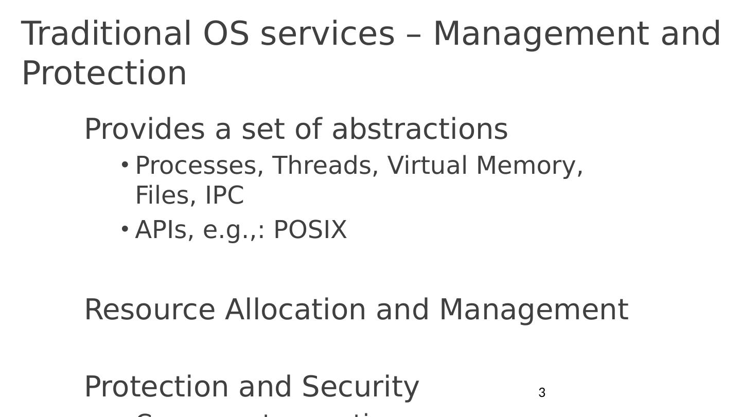 3 .3 Traditional OS services – Management and Protection Provides a set of abstractions Processes, Threads, Virtual Memory, Files, IPC APIs, e.g.,: POSIX Resource Allocation and Management Protection and Security Concurrent execution