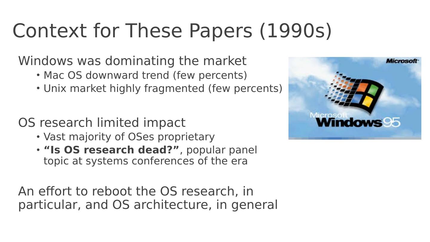 5 .Context for These Papers (1990s) Windows was dominating the market Mac OS downward trend (few percents ) Unix market highly fragmented (few percents ) OS research limited impact Vast majority of OSes proprietary “Is OS research dead?” , popular panel topic at systems conferences of the era An effort to reboot the OS research, in particular, and OS architecture, in general