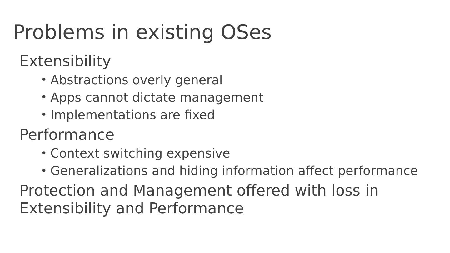 8 .Problems in existing OSes Extensibility Abstractions overly general Apps cannot dictate management Implementations are fixed Performance Context switching expensive Generalizations and hiding information affect performance Protection and Management offered with loss in Extensibility and Performance