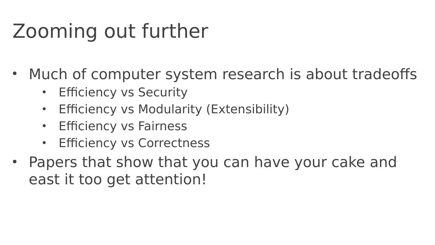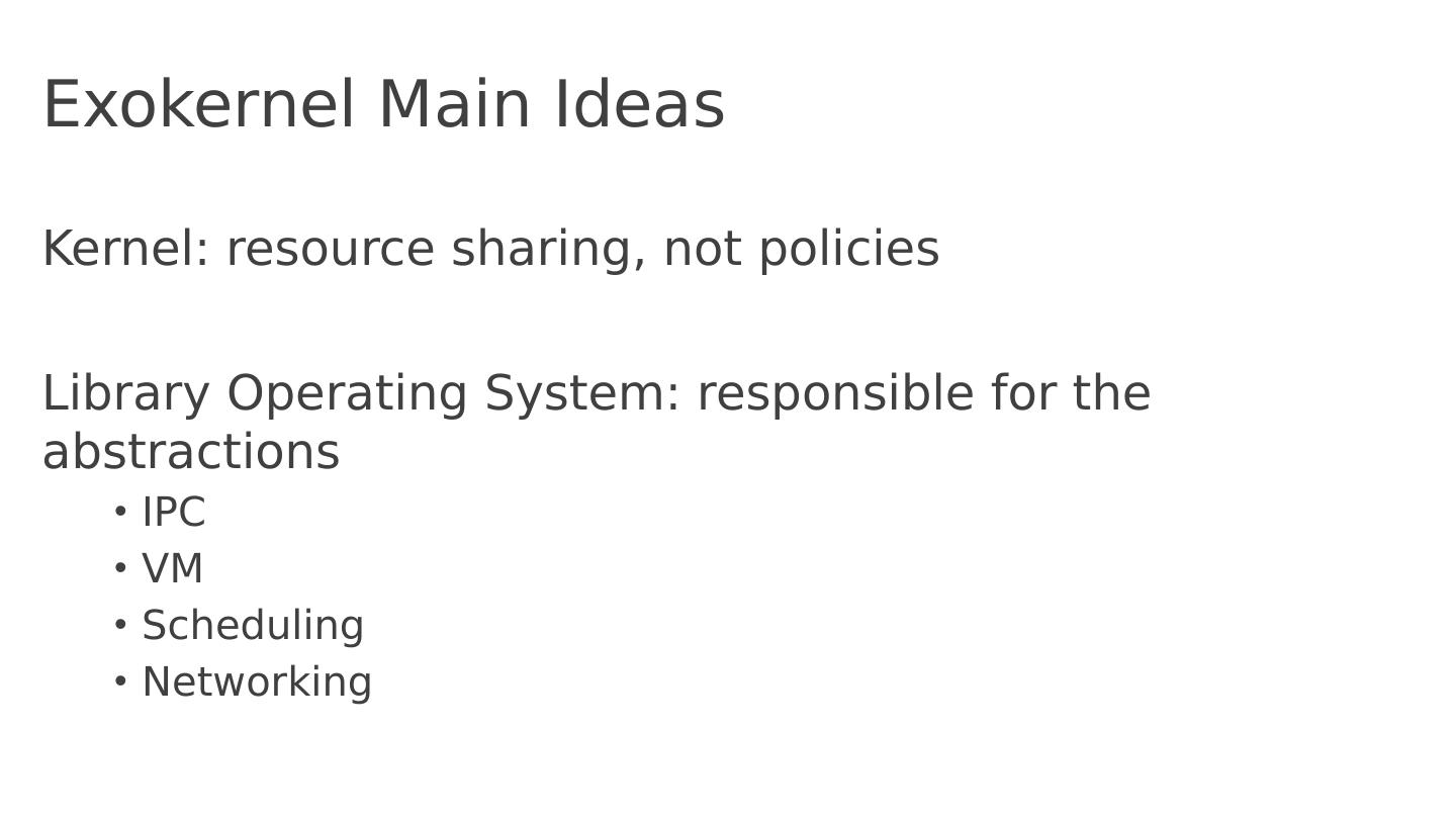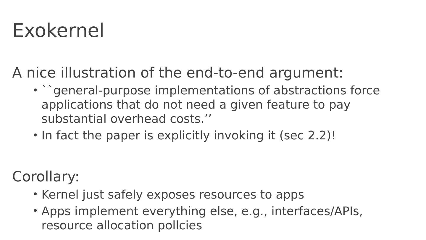12 .Exokernel A nice illustration of the end-to-end argument: ``general-purpose implementations of abstractions force applications that do not need a given feature to pay substantial overhead costs .’’ In fact the paper is explicitly invoking it (sec 2.2)! Corollary: Kernel just safely exposes resources to apps Apps implement everything else, e.g., interfaces/APIs, resource allocation pollcies