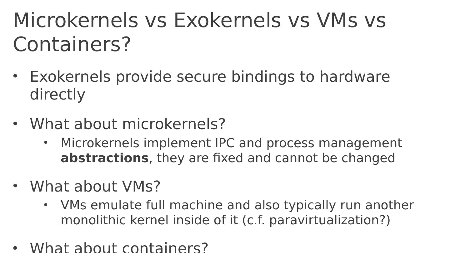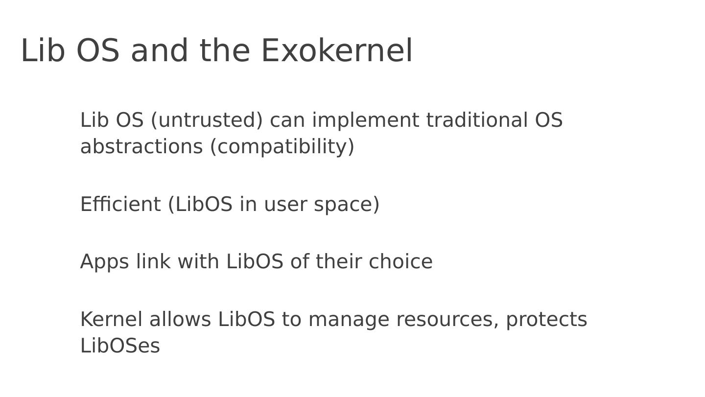15 .Lib OS and the Exokernel Lib OS (untrusted) can implement traditional OS abstractions (compatibility) Efficient ( LibOS in user space) Apps link with LibOS of their choice Kernel allows LibOS to manage resources, protects LibOSes