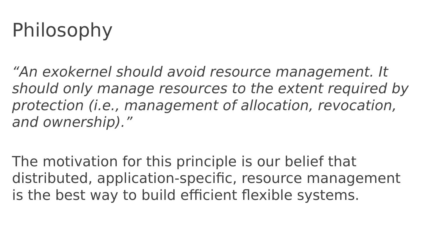16 .Philosophy “An exokernel should avoid resource management. It should only manage resources to the extent required by protection (i.e., management of allocation, revocation, and ownership ).” The motivation for this principle is our belief that distributed, application-specific, resource management is the best way to build efficient flexible systems.
