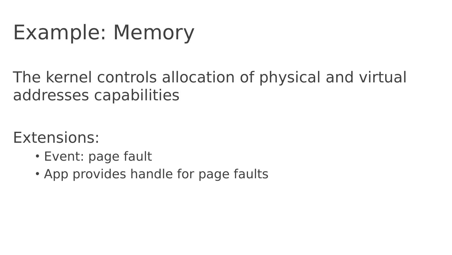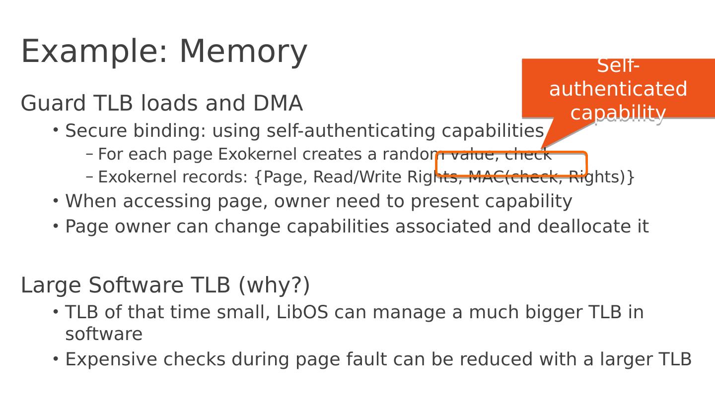 20 .Example: Memory Guard TLB loads and DMA Secure binding: using self-authenticating capabilities For each page E xokernel creates a random value, check Exokernel records: {Page, Read/Write Rights , MAC(check, Rights) } When accessing page, owner need to present capability Page owner can change capabilities associated and deallocate it Large Software TLB (why?) TLB of that time small, LibOS can manage a much bigger TLB in software Expensive checks during page fault can be reduced with a larger TLB Self-authenticated capability