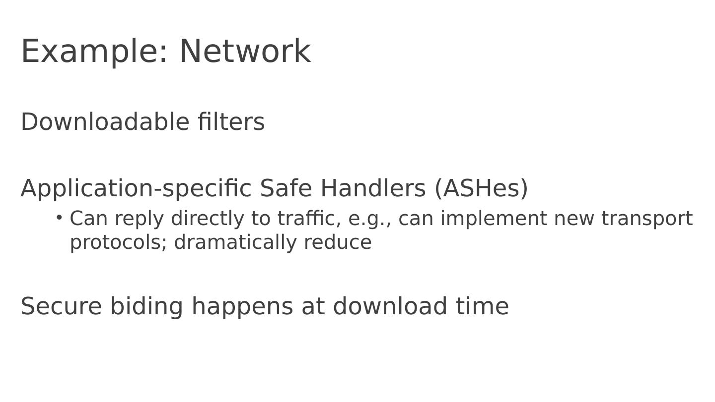 22 .Example: Network Downloadable filters Application-specific Safe Handlers ( ASHes ) Can reply directly to traffic, e.g., can implement new transport protocols; dramatically reduce Secure biding happens at download time