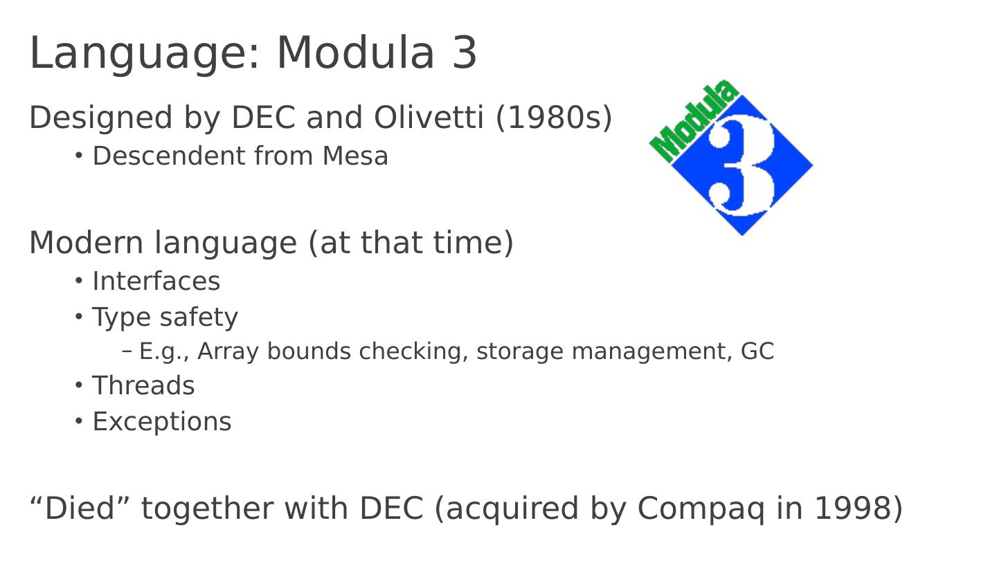 27 .Language: Modula 3 Designed by DEC and Olivetti (1980s) Descendent from Mesa Modern language (at that time) Interfaces Type safety E.g., Array bounds checking, storage m anagement, GC Threads Exceptions “Died” together with DEC (acquired by Compaq in 1998)