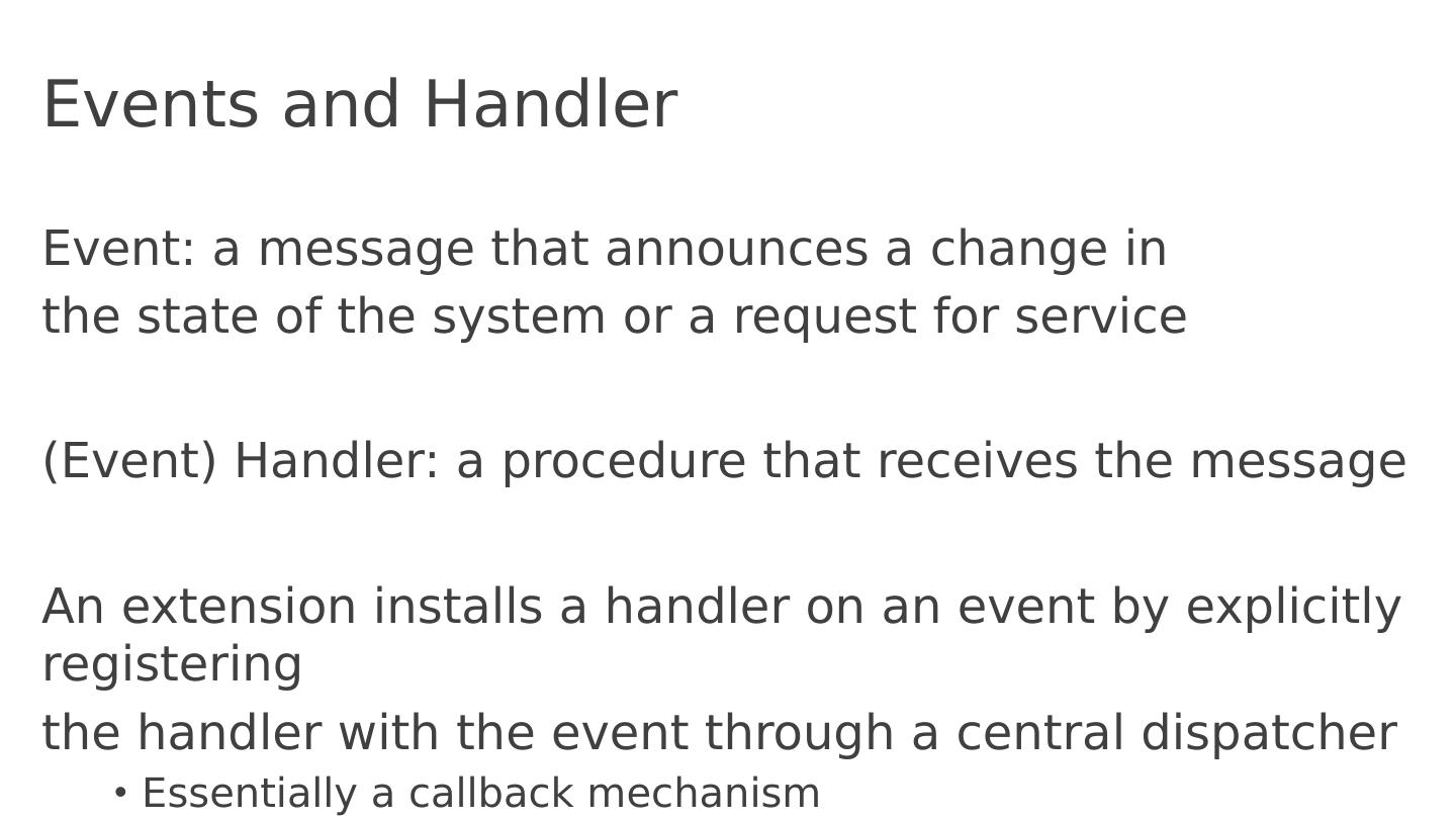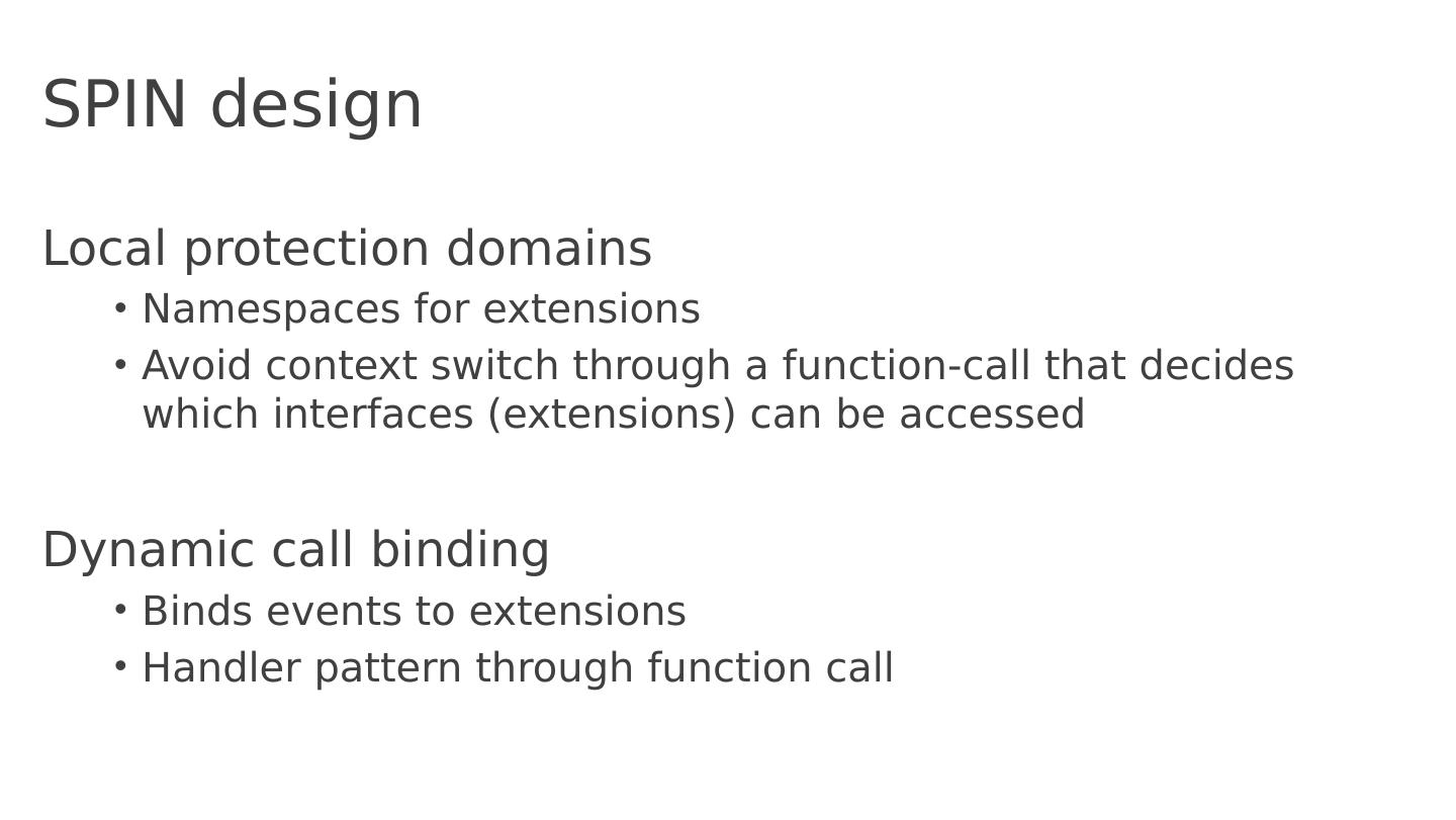 29 .SPIN design Local protection domains Namespaces for extensions Avoid context switch through a function-call that decides which interfaces (extensions) can be accessed Dynamic call binding Binds events to extensions Handler pattern through function call