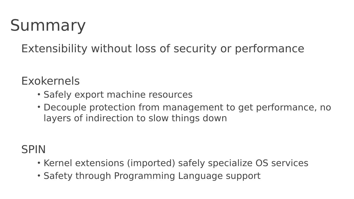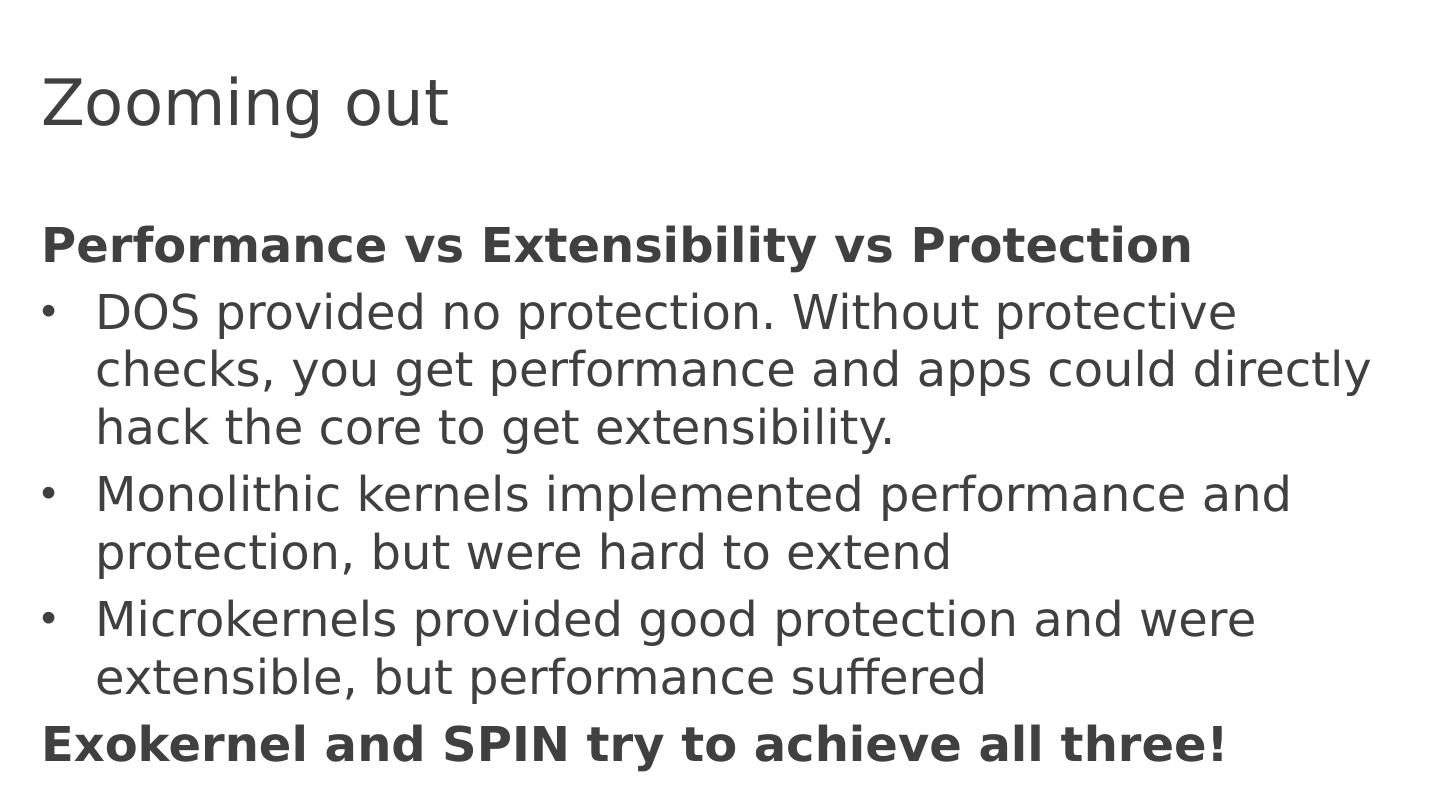 11 .Two Papers, Two Approaches Exokernel : Very minimalist kernel, most functionality implemented in user space Assumed many apps have widely different requirements, maximal extensibility SPIN: Dynamically link extensions into the kernel Rely on programming language features, e.g. static typechecking Assumed device drivers need flexibility, so focused on how to enable them while staying protected