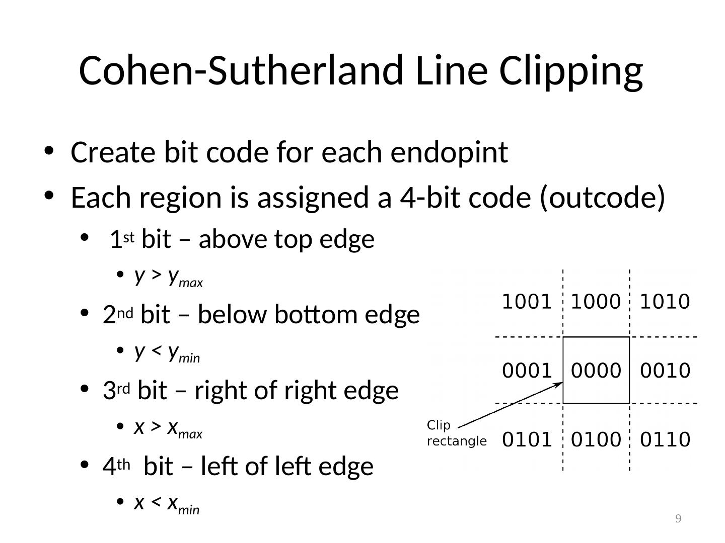 9 .Cohen-Sutherland Line Clipping Create bit code for each endopint Each region is assigned a 4-bit code ( outcode ) 1 st bit – above top edge y > y max 2 nd bit – below bottom edge y < y min 3 rd bit – right of right edge x > x max 4 th bit – left of left edge x < x min 9