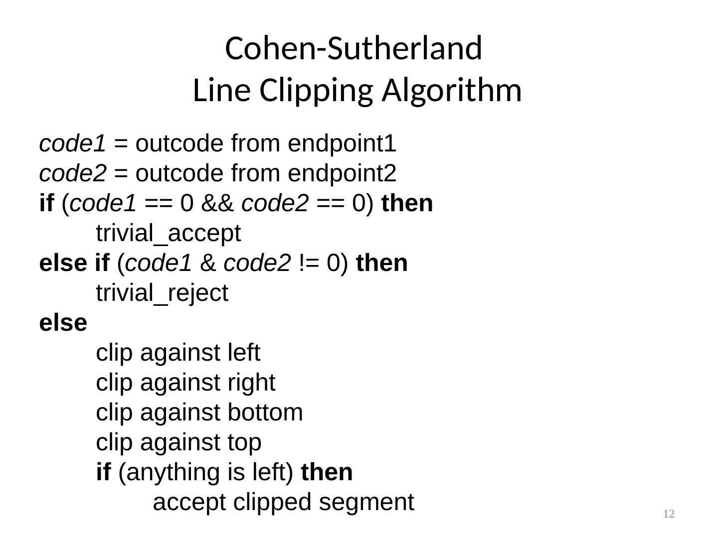 12 .Cohen-Sutherland Line Clipping Algorithm 12 code1 = outcode from endpoint1 code2 = outcode from endpoint2 if ( code1 == 0 && code2 == 0) then trivial_accept else if ( code1 & code2 != 0) then trivial_reject else clip against left clip against right clip against bottom clip against top if (anything is left) then accept clipped segment