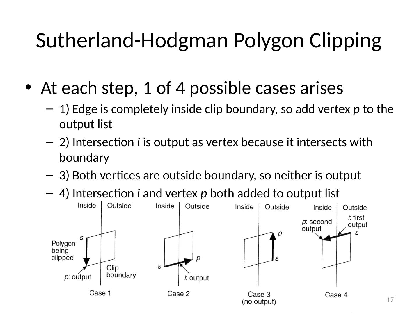 17 .Sutherland-Hodgman Polygon Clipping At each step, 1 of 4 possible cases arises 1) Edge is completely inside clip boundary, so add vertex p to the output list 2) Intersection i is output as vertex because it intersects with boundary 3) Both vertices are outside boundary, so neither is output 4) Intersection i and vertex p both added to output list 17