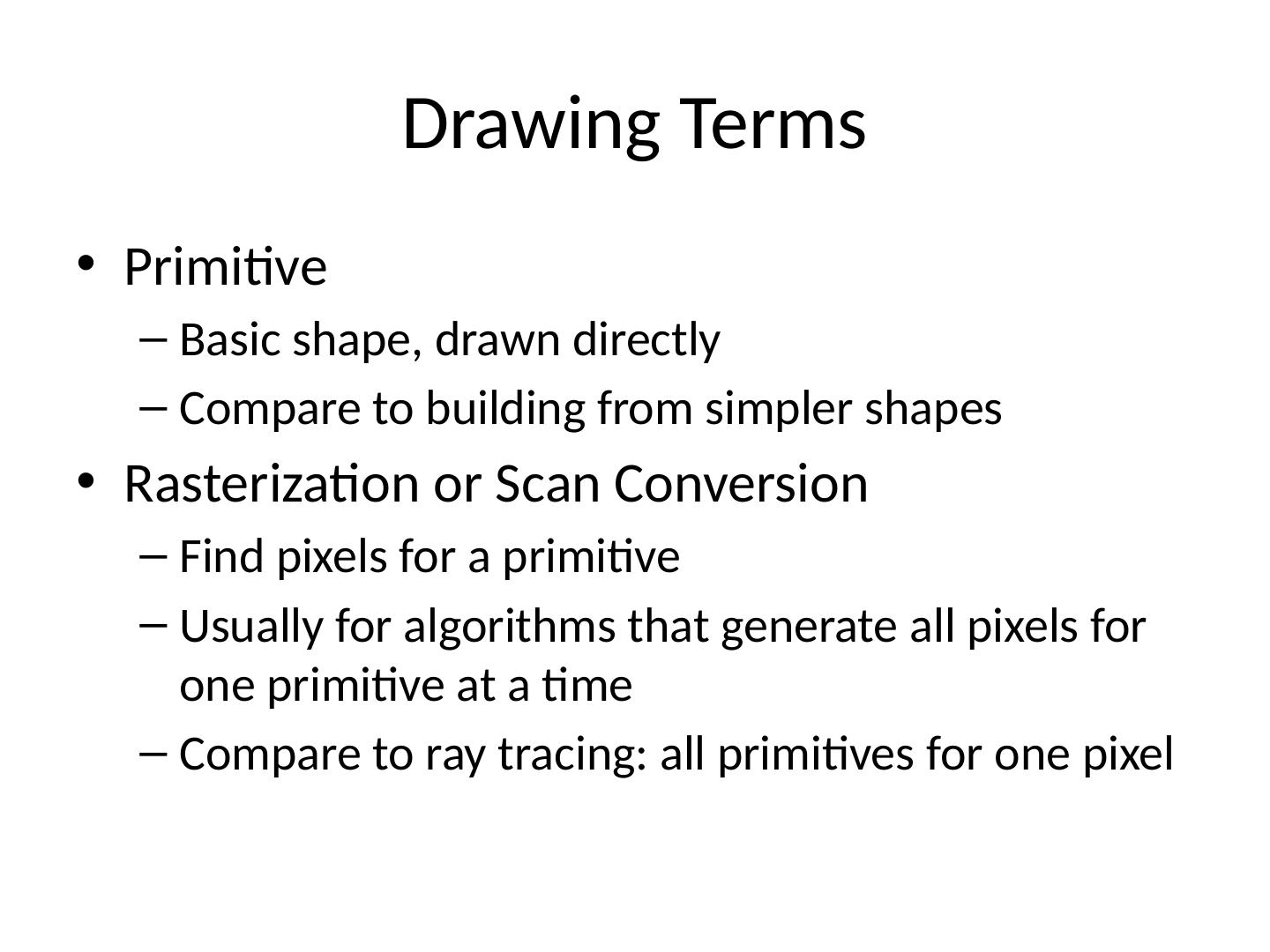 2 .Drawing Terms Primitive Basic shape, drawn directly Compare to building from simpler shapes Rasterization or Scan Conversion Find pixels for a primitive Usually for algorithms that generate all pixels for one primitive at a time Compare to ray tracing: all primitives for one pixel
