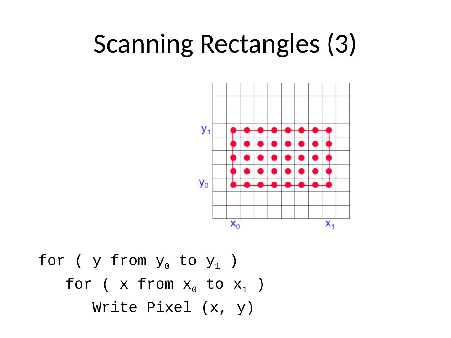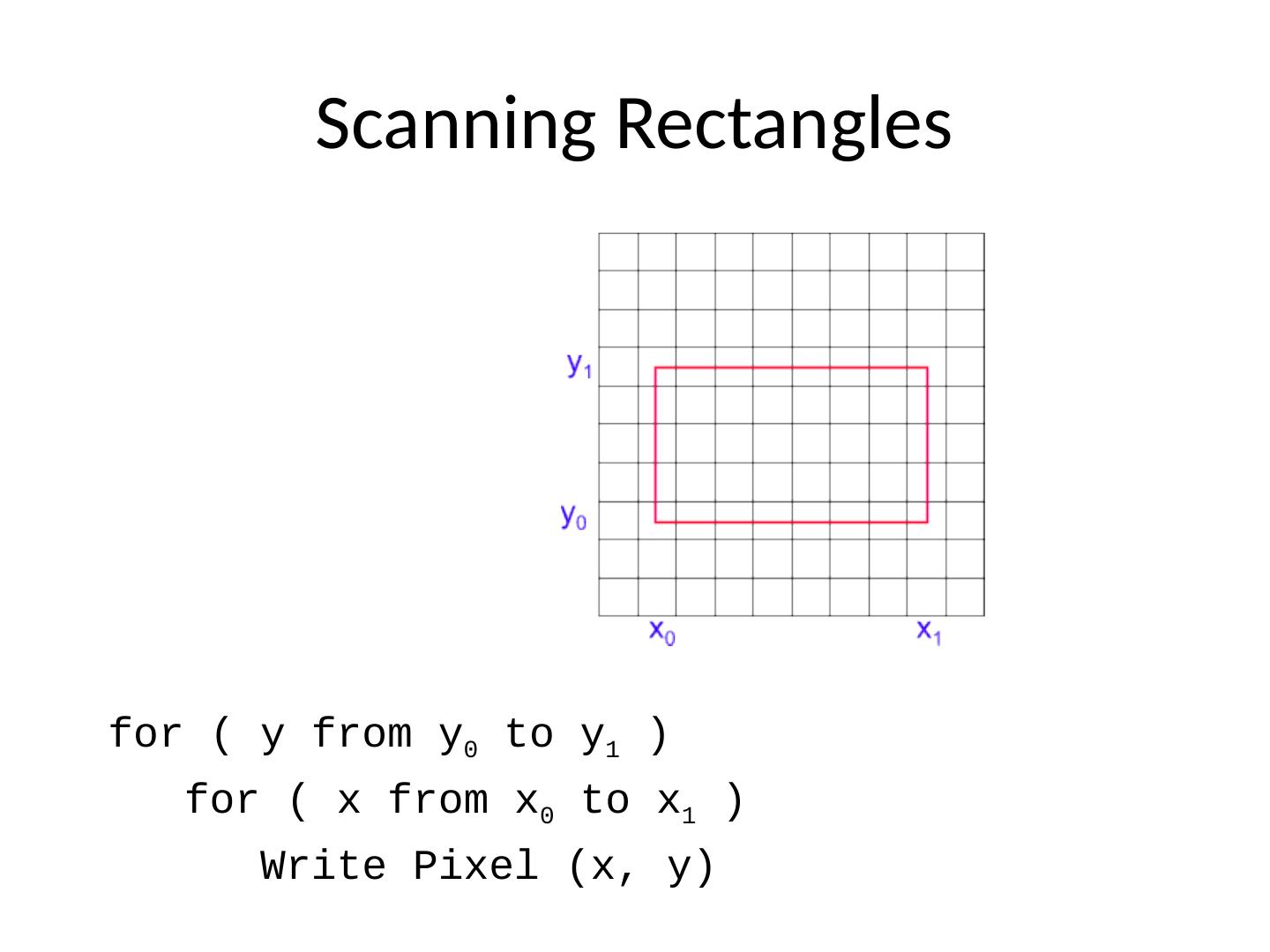 10 .Scanning Rectangles (2) for ( y from y 0 to y 1 ) for ( x from x 0 to x 1 ) Write Pixel (x, y)