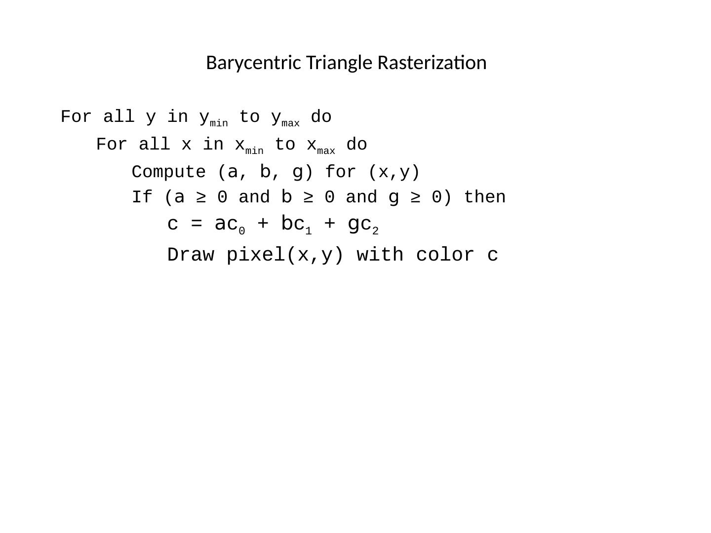 13 .Barycentric Triangle Rasterization For all y in y min to y max do For all x in x min to x max do Compute ( a , b , g ) for ( x,y ) If ( a ≥ 0 and b ≥ 0 and g ≥ 0) then c = a c 0 + b c 1 + g c 2 Draw pixel( x,y ) with color c
