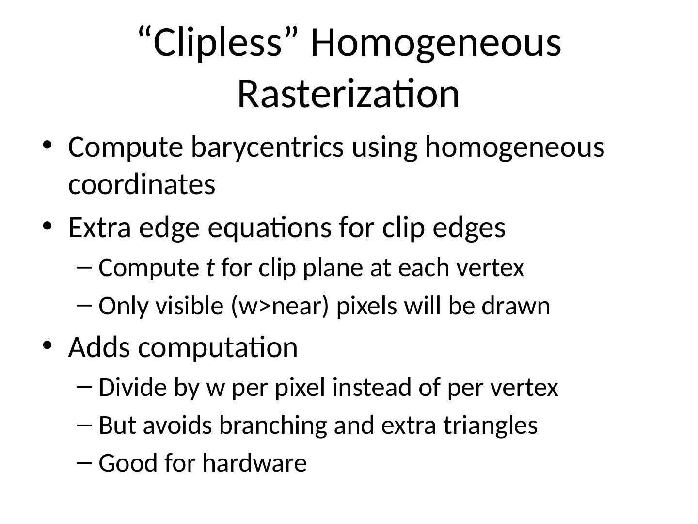 15 .“ Clipless ” Homogeneous Rasterization Compute barycentrics using homogeneous coordinates Extra edge equations for clip edges Compute t for clip plane at each vertex Only visible (w>near) pixels will be drawn Adds computation Divide by w per pixel instead of per vertex But avoids branching and extra triangles Good for hardware