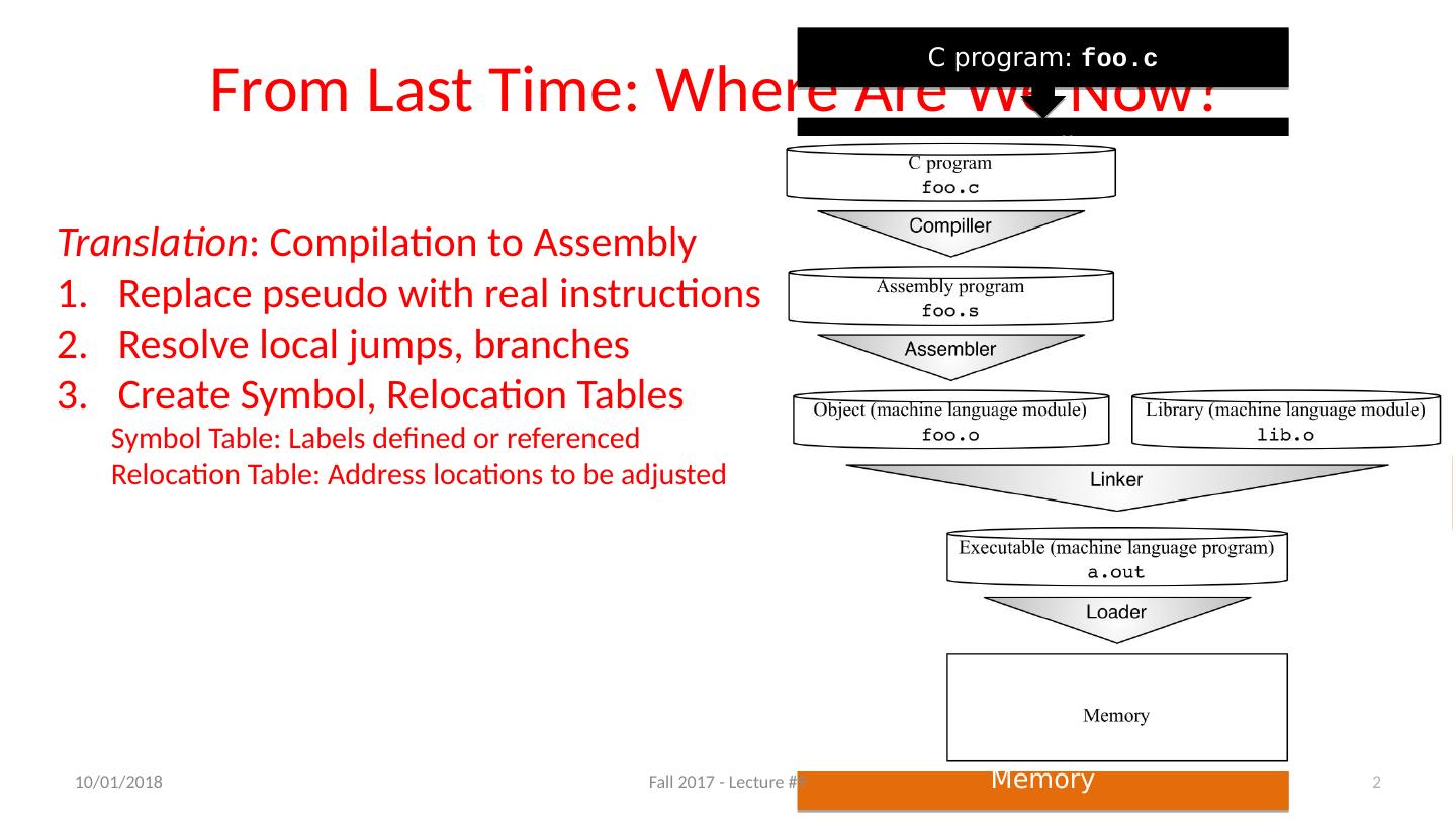 2 .From Last Time: Where Are We Now? 9/20/17 Fall 2017 - Lecture #9 2 Translation : Compilation to Assembly Replace pseudo with real instructions Resolve local jumps, branches Create Symbol, Relocation Tables Symbol Table: Labels defined or referenced Relocation Table: Address locations to be adjusted