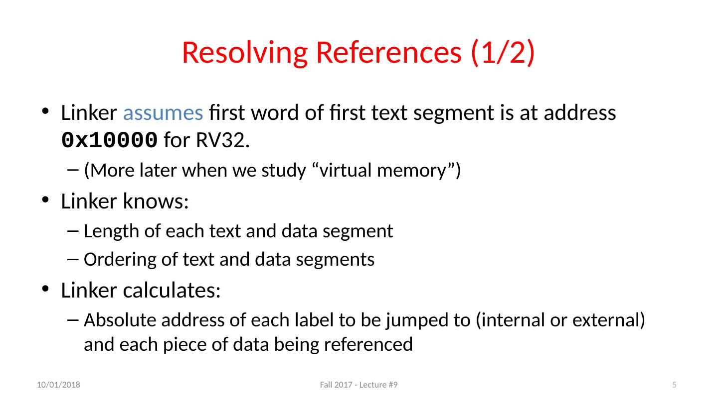 5 .Resolving References (1/2) Linker assumes first word of first text segment is at address 0x10000 for RV32 . (More later when we study “virtual memory”) Linker knows: L ength of each text and data segment O rdering of text and data segments Linker calculates: A bsolute address of each label to be jumped to (internal or external) and each piece of data being referenced 5 9/20/17 Fall 2017 - Lecture #9