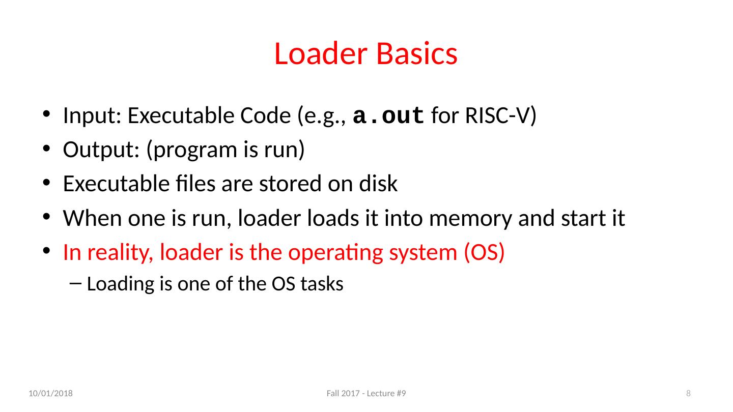 8 .Loader Basics Input: Executable Code (e.g., a.out for RISC-V) Output: (program is run) Executable files are stored on disk When one is run, loader loads it into memory and start it In reality, loader is the operating system (OS) L oading is one of the OS tasks 8 9/20/17 Fall 2017 - Lecture #9