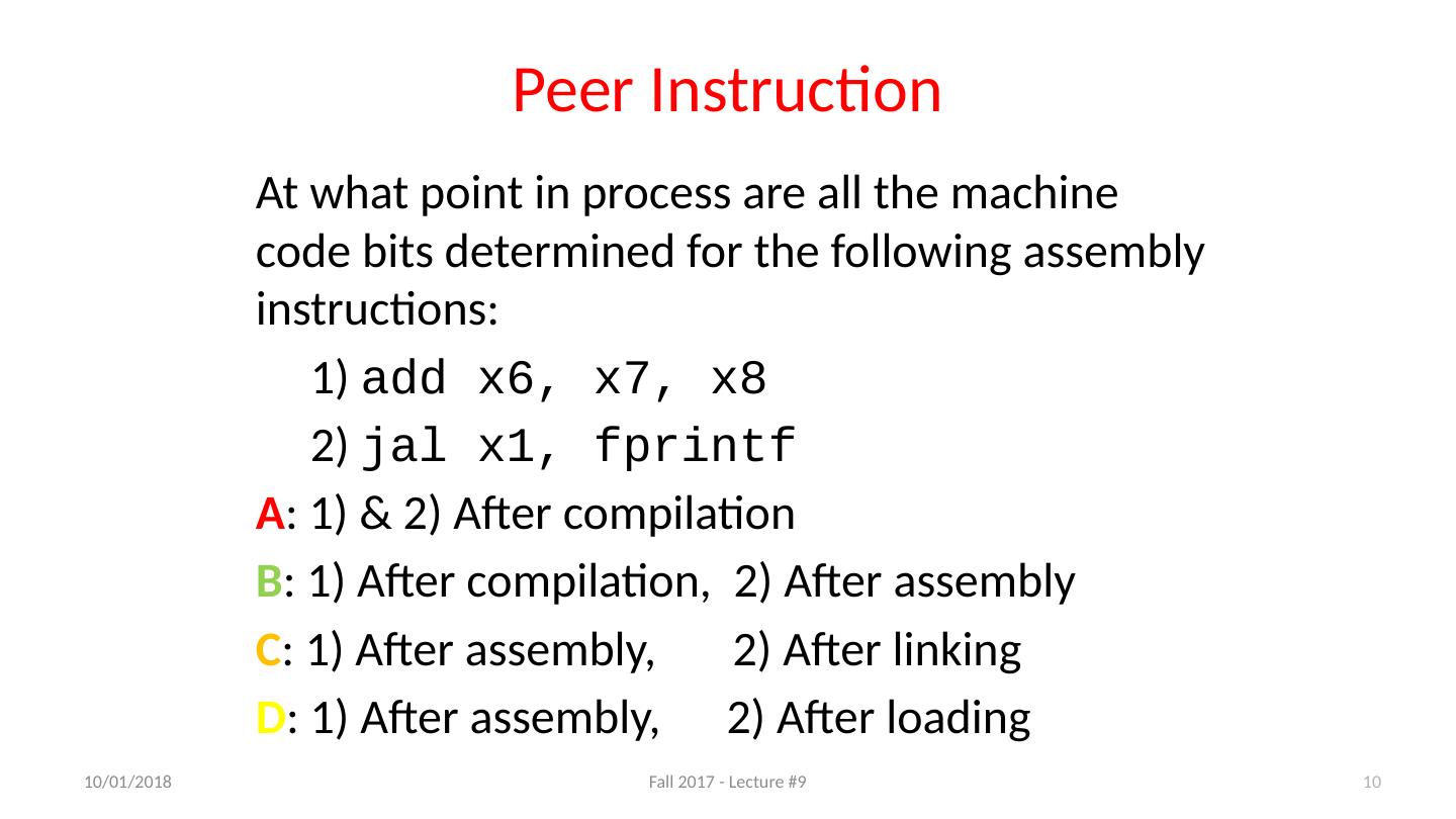 10 .Peer Instruction At what point in process are all the machine code bits determined for the following assembly instructions: 1) add x6, x7, x8 2) jal x1, fprintf A : 1) & 2) After compilation B : 1) After compilation, 2) After assembly C : 1) After assembly, 2) After linking D : 1) After assembly, 2) After loading 9/20/17 Fall 2017 - Lecture #9 10