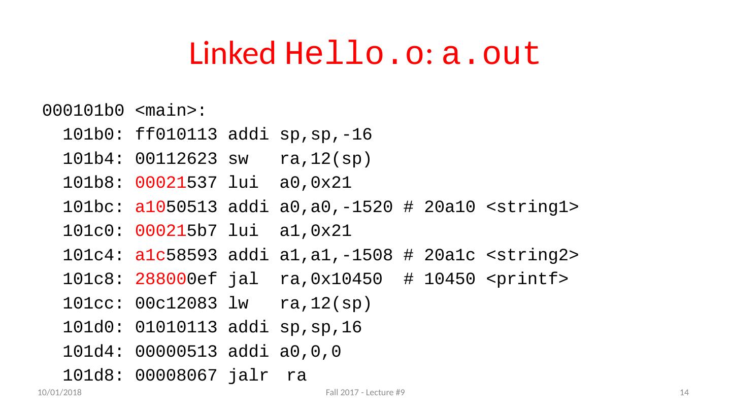 14 .Linked Hello.o : a.out 000101b0 < main >: 101b0 : ff010113 addi sp,sp,-16 101b4 : 00112623 sw ra,12( sp ) 101b8 : 00021 537 lui a0,0x21 101bc : a10 50513 addi a0,a0,-1520 # 20a10 <string1> 101c0 : 00021 5b7 lui a1,0x21 101c4 : a1c 58593 addi a1,a1,-1508 # 20a1c <string2> 101c8 : 28800 0ef jal ra , 0x 10450 # 10450 < printf > 101cc : 00c12083 lw ra,12( sp ) 101d0 : 01010113 addi sp,sp,16 101d4 : 00000513 addi a0,0 ,0 101d8 : 00008067 jalr ra 14 9/20/17 Fall 2017 - Lecture #9