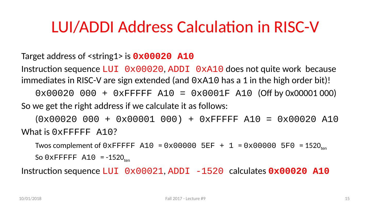 15 .LUI/ADDI Address Calculation in RISC-V Target address of <string1> is 0x00020 A10 Instruction sequence LUI 0x00020 , ADDI 0xA10 does not quite work because immediates in RISC-V are sign extended (and 0xA10 has a 1 in the high order bit)! 0x00020 000 + 0xFFFFF A10 = 0x0001F A10 (Off by 0x00001 000) So we get the right address if we calculate it as follows: ( 0x00020 000 + 0x00001 000) + 0xFFFFF A10 = 0x00020 A10 What is 0xFFFFF A10 ? Twos complement of 0xFFFFF A10 = 0x00000 5EF + 1 = 0x00000 5F0 = 1520 ten So 0xFFFFF A10 = -1520 ten Instruction sequence LUI 0x00021 , ADDI -1520 calculates 0x00020 A10 15 9/20/17 Fall 2017 - Lecture #9
