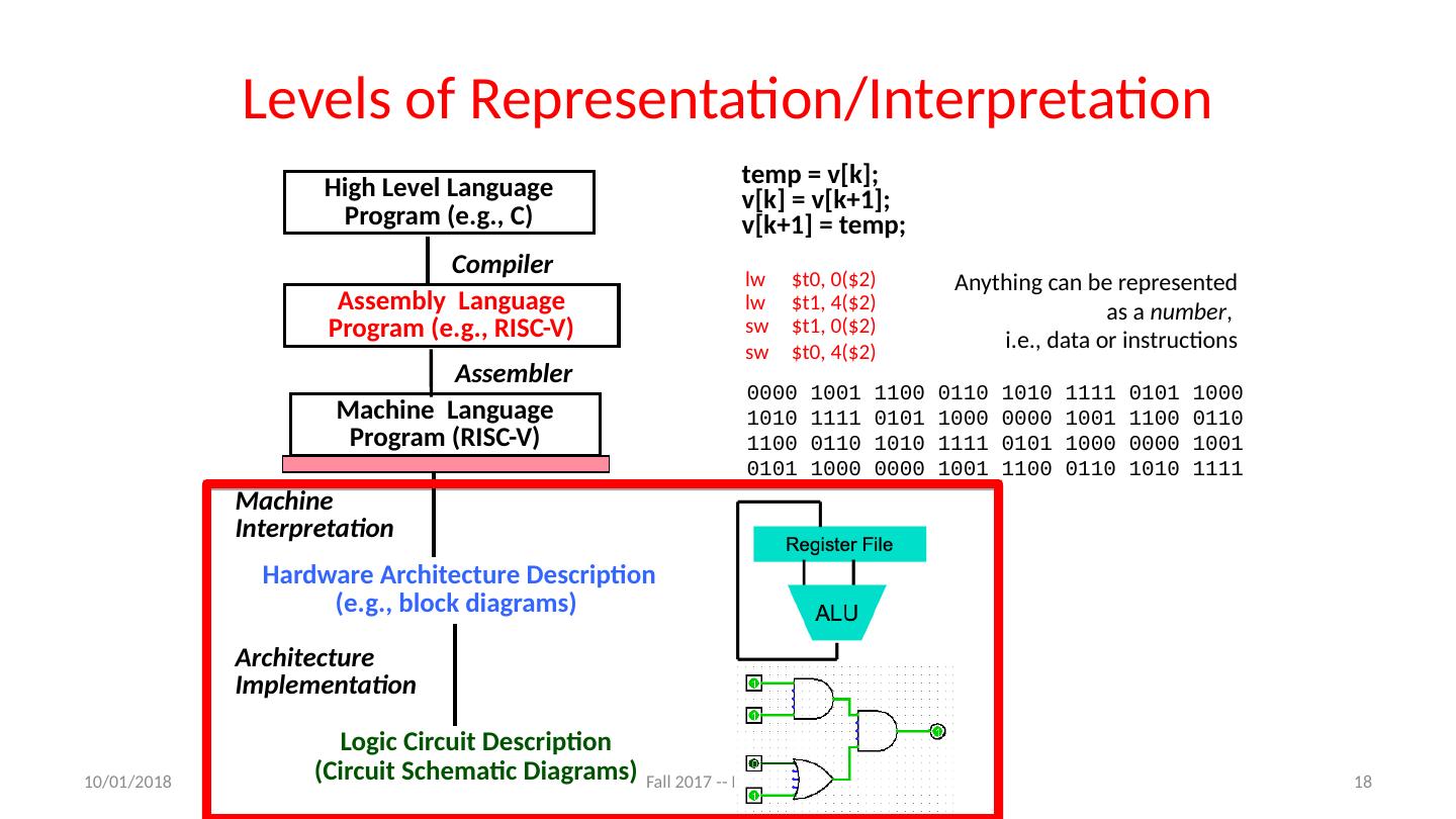 18 .Levels of Representation/Interpretation lw $t0, 0($2) lw $t1, 4($2) sw $t1, 0($2) sw $t0, 4($2) High Level Language Program (e.g., C) Assembly Language Program (e.g., RISC-V) Machine Language Program (RISC-V) Hardware Architecture Description (e.g., block diagrams) Compiler Assembler Machine Interpretation temp = v[k]; v[k] = v[k+1]; v[k+1] = temp; 0000 1001 1100 0110 1010 1111 0101 1000 1010 1111 0101 1000 0000 1001 1100 0110 1100 0110 1010 1111 0101 1000 0000 1001 0101 1000 0000 1001 1100 0110 1010 1111 Logic Circuit Description (Circuit Schematic Diagrams) Architecture Implementation Anything can be represented as a number , i.e., data or instructions 9/20/17 18 Fall 2017 -- Lecture #9