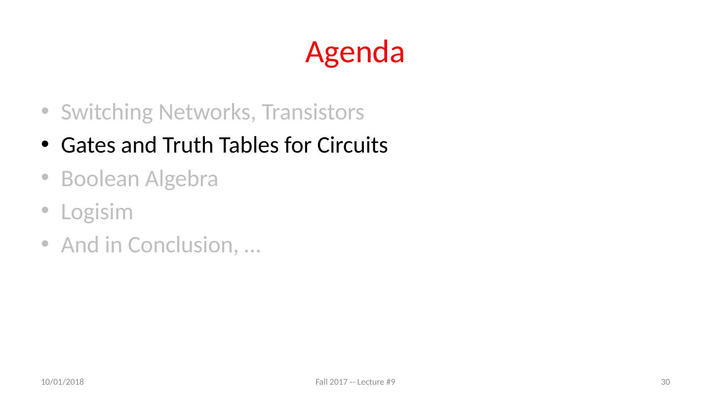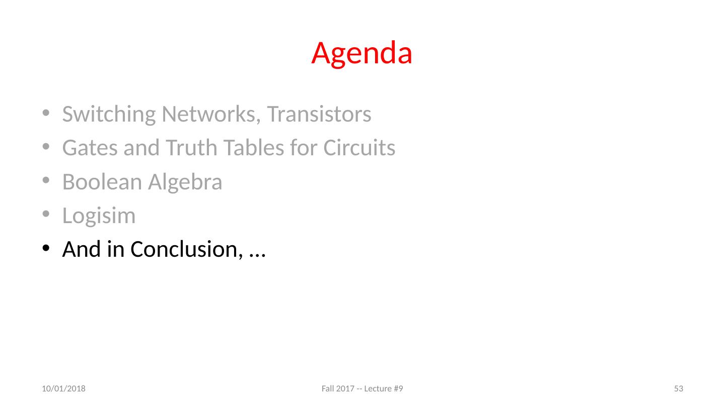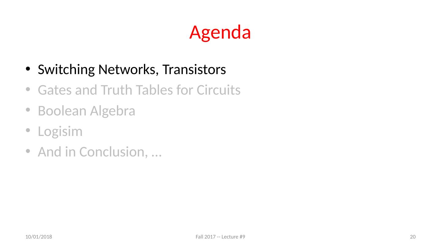 19 .Agenda Switching Networks, Transistors Gates and Truth Tables for Circuits Boolean Algebra Logisim And in Conclusion, … 9/20/17 19 Fall 2017 -- Lecture #9
