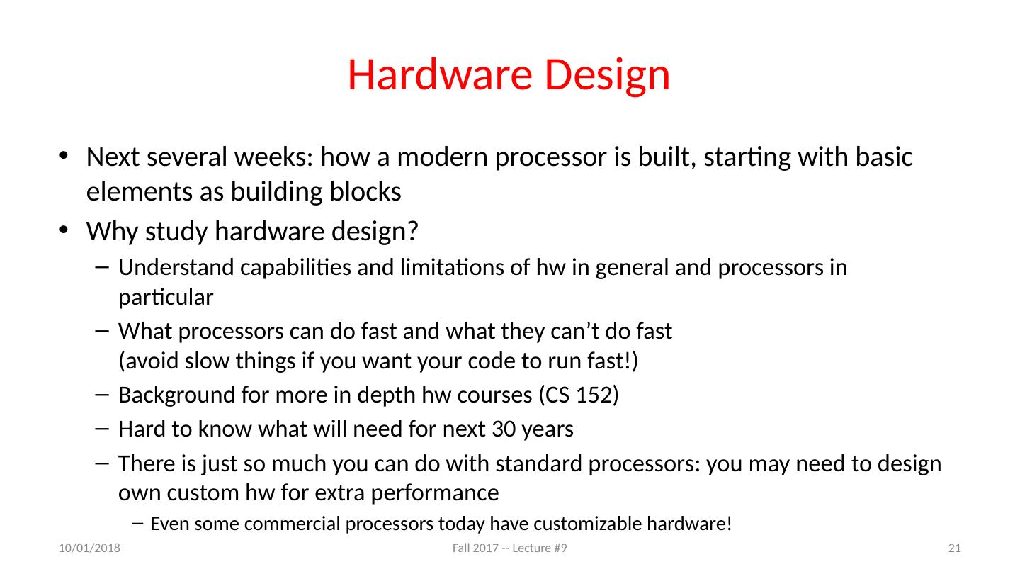 21 .Hardware Design Next several weeks: how a modern processor is built, starting with basic elements as building blocks Why study hardware design? Understand capabilities and limitations of hw in general and processors in particular What processors can do fast and what they can’t do fast (avoid slow things if you want your code to run fast!) Background for more in depth hw courses (CS 152) Hard to know what will need for next 30 years There is just so much you can do with standard processors: you may need to design own custom hw for extra performance Even some commercial processors today have customizable hardware! 9/20/17 Fall 2017 -- Lecture #9 21