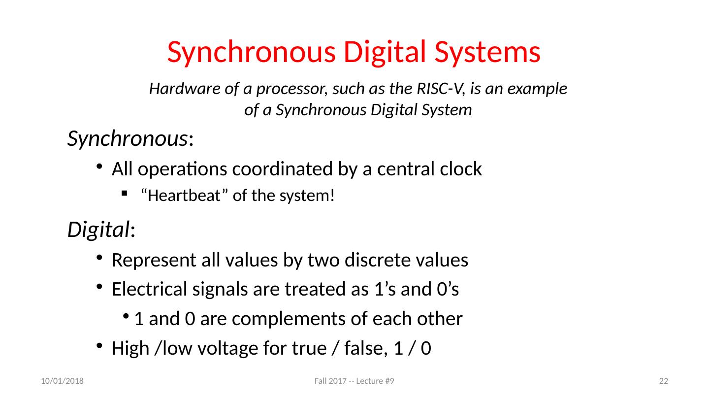 22 .Synchronous Digital Systems 9/20/17 Fall 2017 -- Lecture #9 22 Synchronous : All operations coordinated by a central clock “Heartbeat” of the system! Digital : Represent all values by two discrete values Electrical signals are treated as 1’s and 0’s 1 and 0 are complements of each other High /low voltage for true / false, 1 / 0 Hardware of a processor, such as the RISC-V, is an example of a Synchronous Digital System