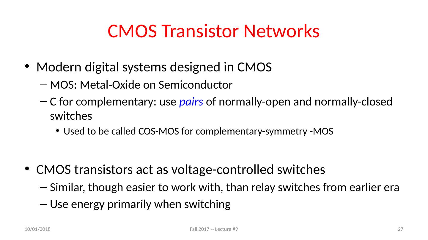 27 .Fall 2017 -- Lecture #9 CMOS Transistor Networks Modern digital systems designed in CMOS MOS: Metal-Oxide on Semiconductor C for complementary: use pairs of normally -open and normally-closed switches Used to be called COS-MOS for complementary-symmetry -MOS CMOS transistors act as voltage-controlled switches Similar, though easier to work with, than relay switches from earlier era Use energy primarily when switching 9/20/17 27