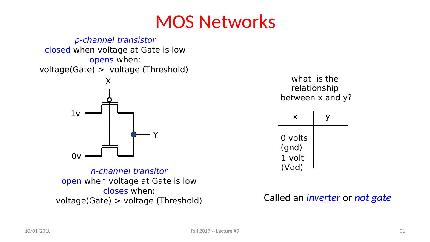 26 .Fall 2017 -- Lecture #9 Transistors High voltage ( V dd ) represents 1, or true Low voltage (0 volts or Ground) represents 0, or false Let threshold voltage ( V th ) decide if a 0 or a 1 If switches control whether voltages can propagate through a circuit, can build a computer Our switches: CMOS transistors 9/20/17 26