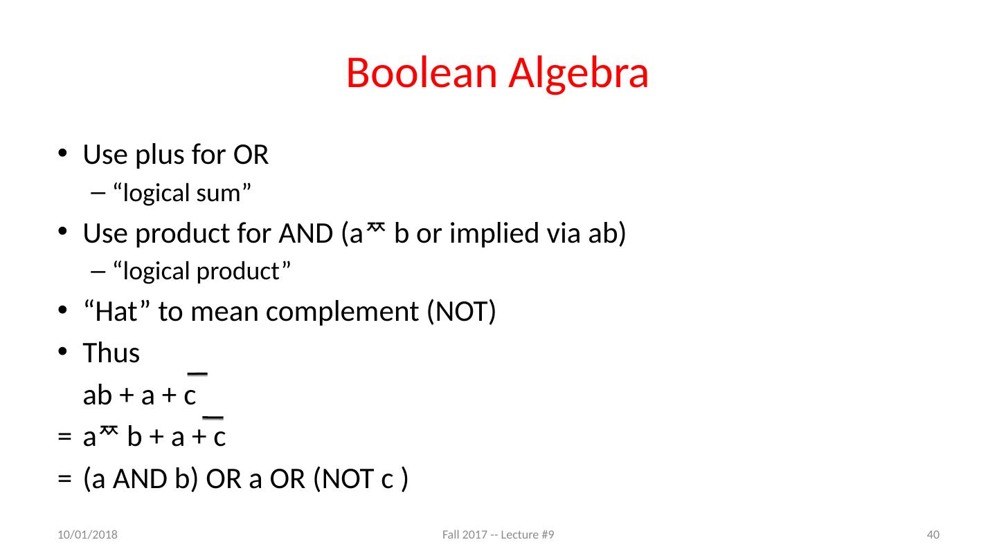 25 .Historical Note Early computer designers built ad hoc circuits from switches Began to notice common patterns in their work: ANDs , ORs , … Master’s thesis (by Claude Shannon) made link between work and 19 th Century Mathematician George Boole Called it “Boolean” in his honor Could apply math to give theory to hardware design, minimization, … 9/20/17 Fall 2017 -- Lecture #9 25
