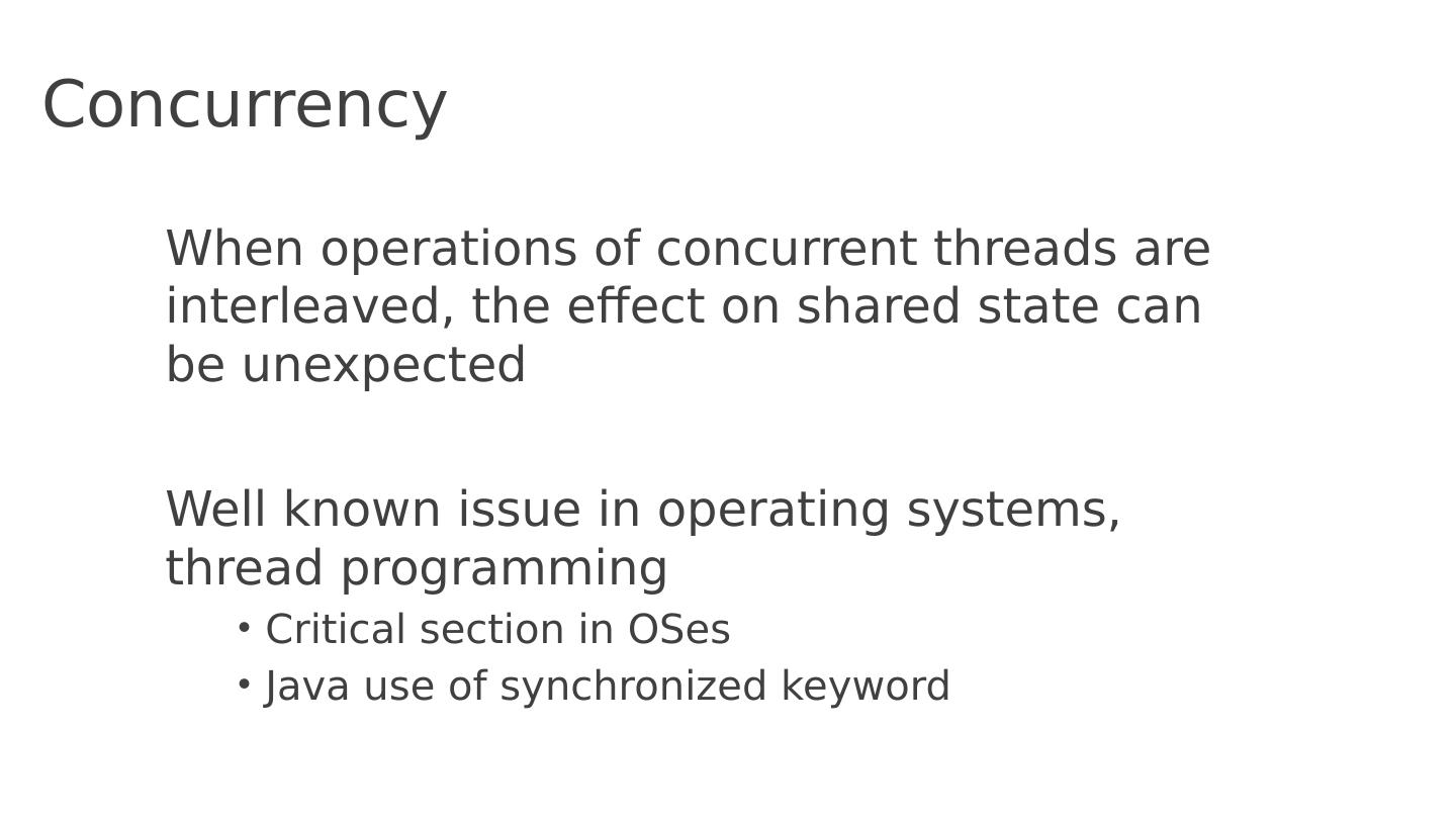 6 .Concurrency When operations of concurrent threads are interleaved, the effect on shared state can be unexpected Well known issue in operating systems, thread programming Critical section in OSes Java use of synchronized keyword