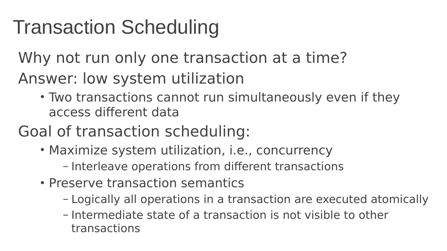 7 .Transaction Scheduling Why not run only one transaction at a time ? Answer: low system utilization Two transactions cannot run simultaneously even if they access different data Goal of transaction scheduling: Maximize system utilization, i.e., concurrency Interleave operations from different transactions Preserve transaction semantics Logically all operations in a transaction are executed atomically Intermediate state of a transaction is not visible to other transactions