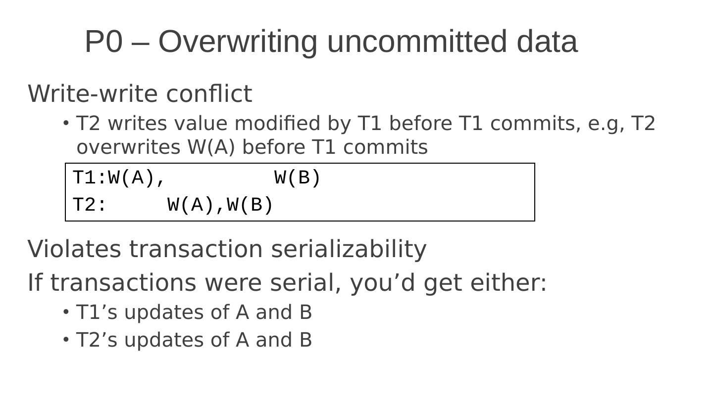 9 .P0 – Overwriting uncommitted data Write-write conflict T2 writes value modified by T1 before T1 commits, e.g , T2 overwrites W(A) before T1 commits Violates transaction serializability If transactions were serial, you ’ d get either: T1 ’ s updates of A and B T2 ’ s updates of A and B T1:W(A), W(B) T2: W(A),W(B)