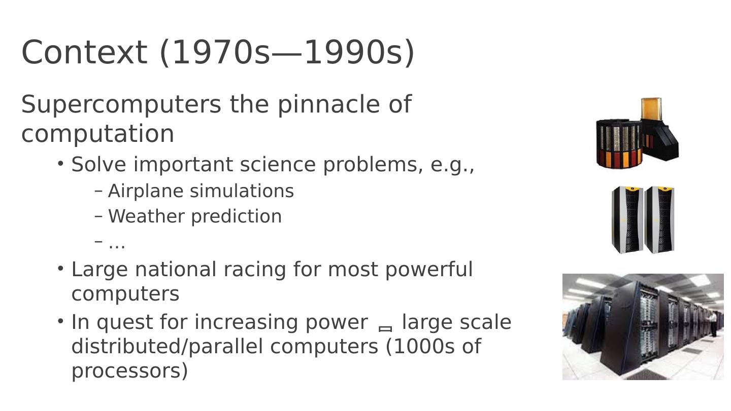 2 .Context (1970s—1990s) Supercomputers the pinnacle of computation Solve important science problems, e.g., Airplane simulations Weather prediction … Large national racing for most powerful computers In quest for increasing power large scale distributed/parallel computers (1000s of processors) Question: how to program these supercomputers?