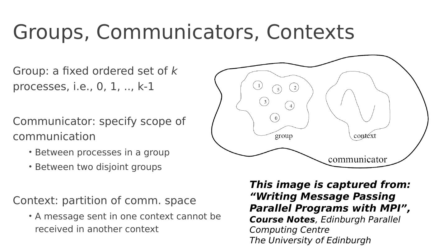 6 .Groups, Communicators, Contexts Group : a fixed ordered set of k processes, i.e., 0, 1, .., k-1 Communicator : specify scope of communication Between processes in a group Between two disjoint groups Context : partition of comm. space A message sent in one context cannot be received in another context This image is captured from: “Writing Message Passing Parallel Programs with MPI”, Course Notes , Edinburgh Parallel Computing Centre The University of Edinburgh