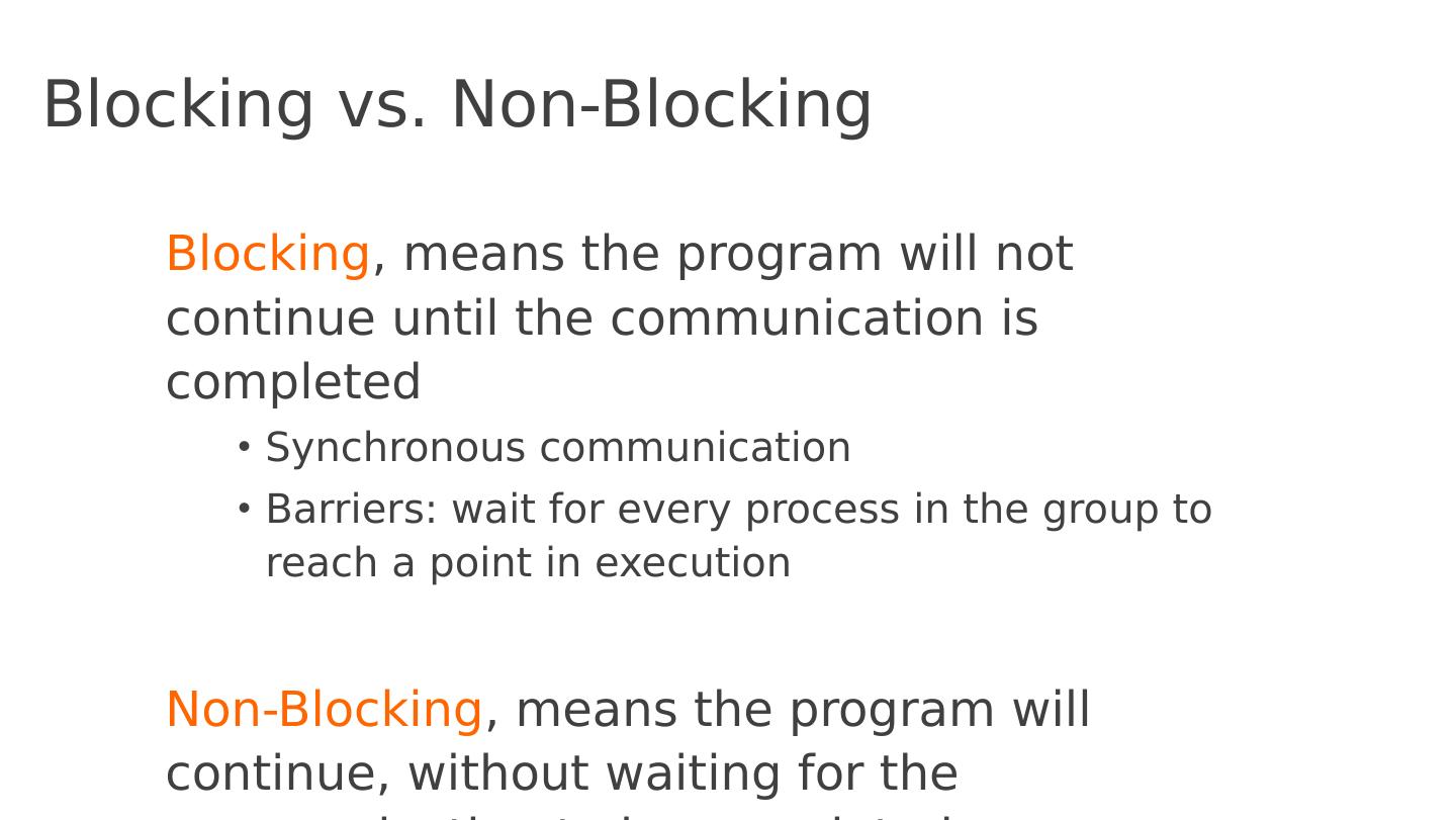 9 .Blocking vs. Non-Blocking Blocking , means the program will not continue until the communication is completed Synchronous communication Barriers: wait for every process in the group to reach a point in execution Non-Blocking , means the program will continue, without waiting for the communication to be completed