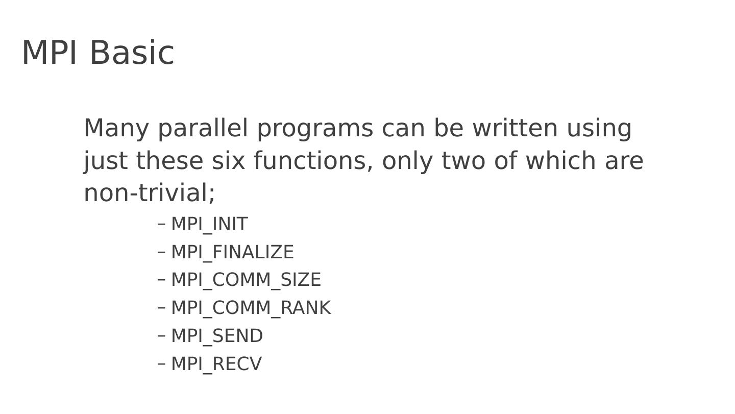 11 .MPI Basic Many parallel programs can be written using just these six functions, only two of which are non-trivial; MPI_INIT MPI_FINALIZE MPI_COMM_SIZE MPI_COMM_RANK MPI_SEND MPI_RECV