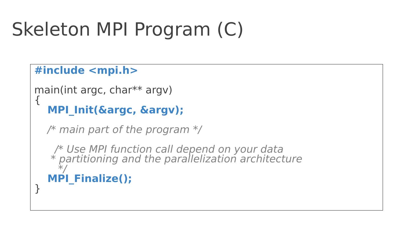 12 .Skeleton MPI Program (C) # include < mpi.h > m ain( int argc , char** argv ) { MPI_Init (& argc , & argv ); /* main part of the program */ / * Use MPI function call depend on your data * partitioning and the parallelization architecture */ MPI_Finalize (); }
