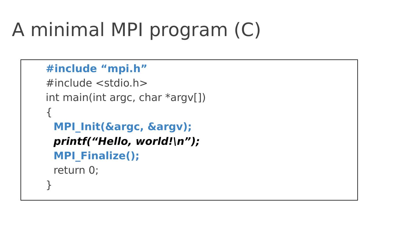 13 .A minimal MPI program (C) # include “ mpi.h ” #include < stdio.h > int main( int argc , char * argv []) { MPI_Init (& argc , & argv ); printf ( “ Hello, world!