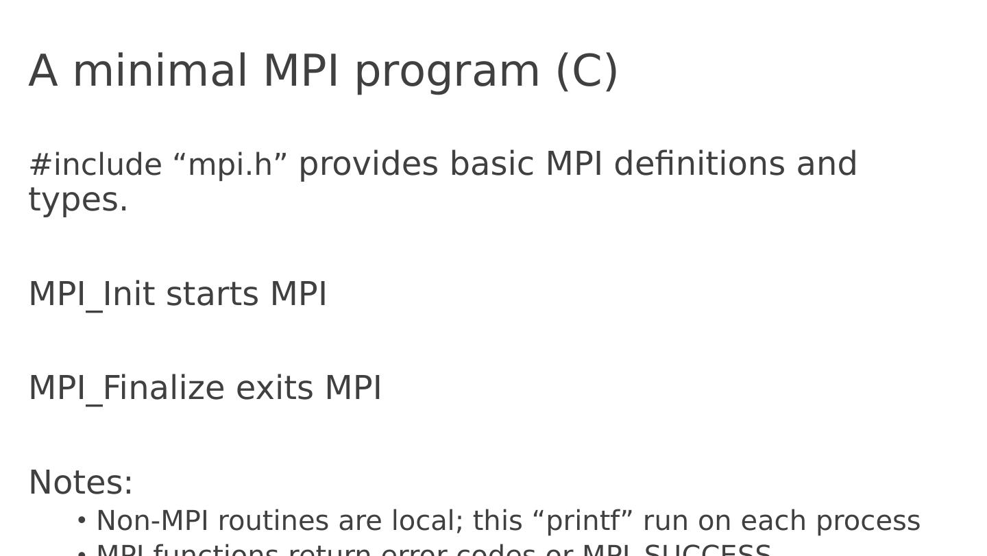 14 .A minimal MPI program (C) #include “ mpi.h ” provides basic MPI definitions and types. MPI_Init starts MPI MPI_Finalize exits MPI Notes: Non-MPI routines are local; this “ printf ” run on each process MPI functions return error codes or MPI_SUCCESS
