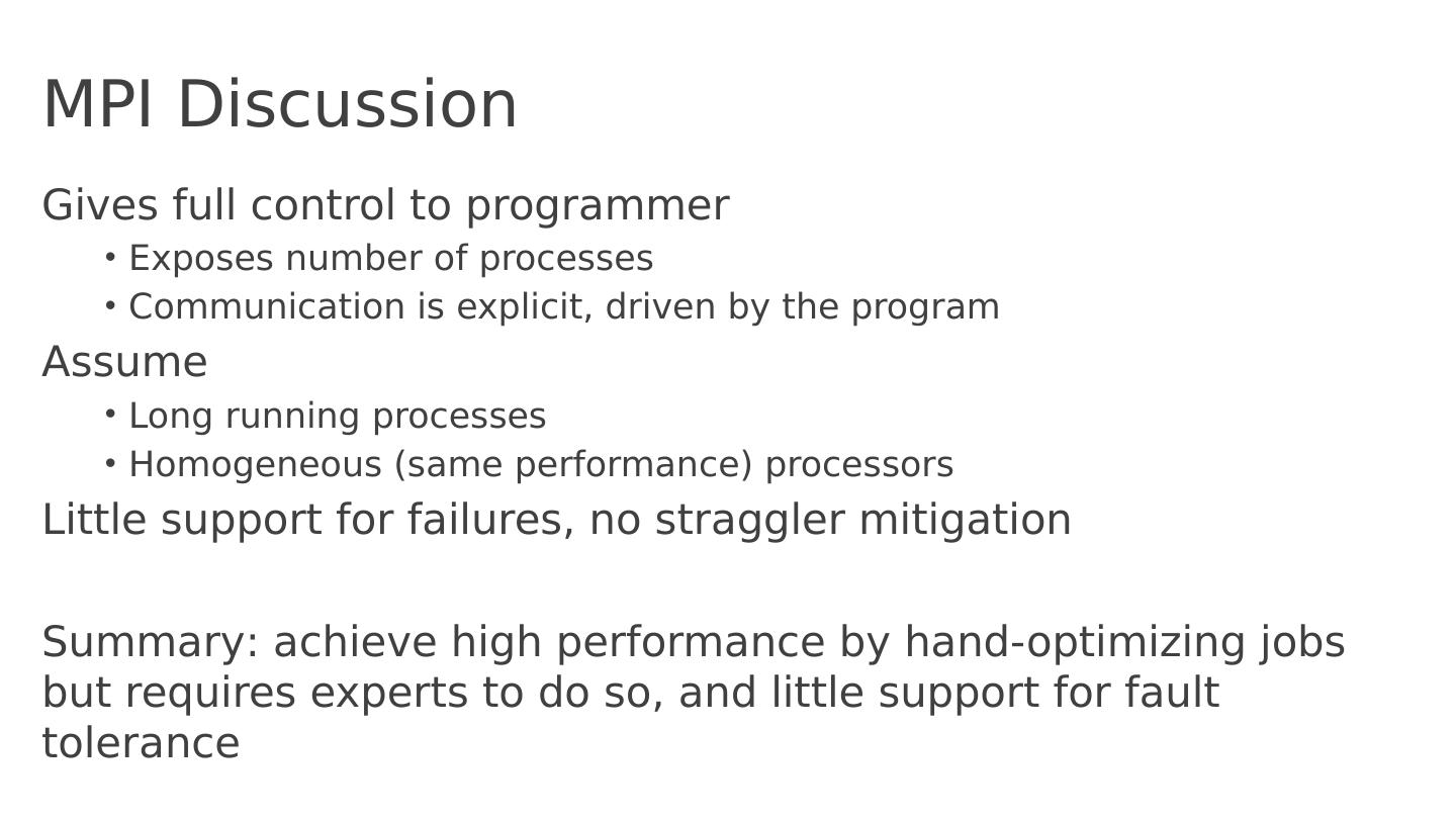 20 .MPI Discussion Gives full control to programmer Exposes number of processes Communication is explicit, driven by the program Assume Long running processes Homogeneous (same performance) processors Little support for failures, no straggler mitigation Summary : achieve high performance by hand-optimizing jobs but requires experts to do so, and little support for fault tolerance