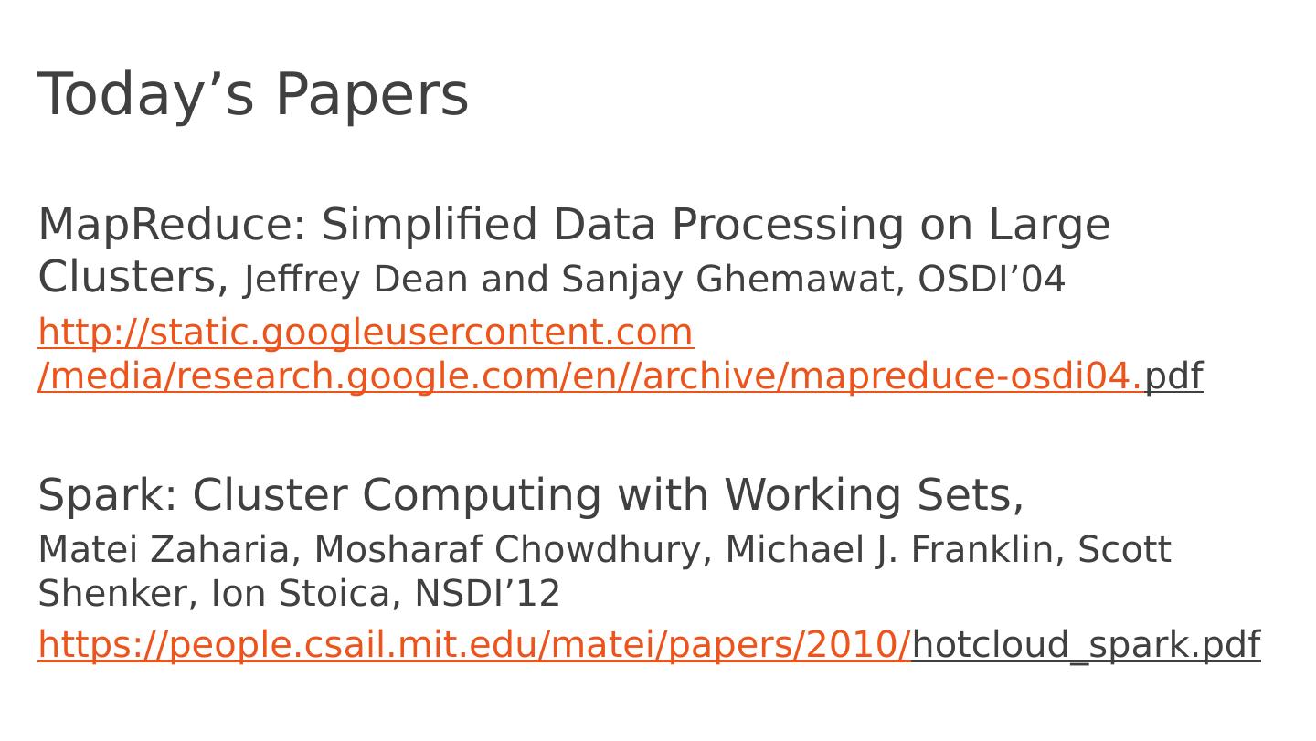21 .Today’s Papers MapReduce: Simplified Data Processing on Large Clusters, Jeffrey Dean and Sanjay Ghemawat , OSDI’04 http://static.googleusercontent.com /media/research.google.com/en//archive/mapreduce-osdi04. pdf Spark: Cluster Computing with Working Sets, Matei Zaharia , Mosharaf Chowdhury , Michael J. Franklin, Scott Shenker , Ion Stoica, NSDI’12 https://people.csail.mit.edu/matei/papers/2010/ hotcloud_spark.pdf