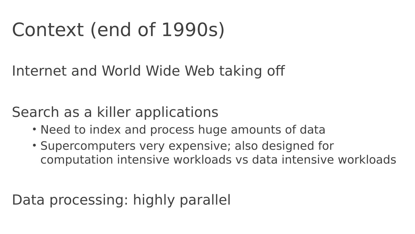 22 .Context (end of 1990s) Internet and World Wide Web taking off Search as a killer applications Need to index and process huge amounts of data Supercomputers very expensive; also designed for computation intensive workloads vs data intensive workloads Data processing: highly parallel