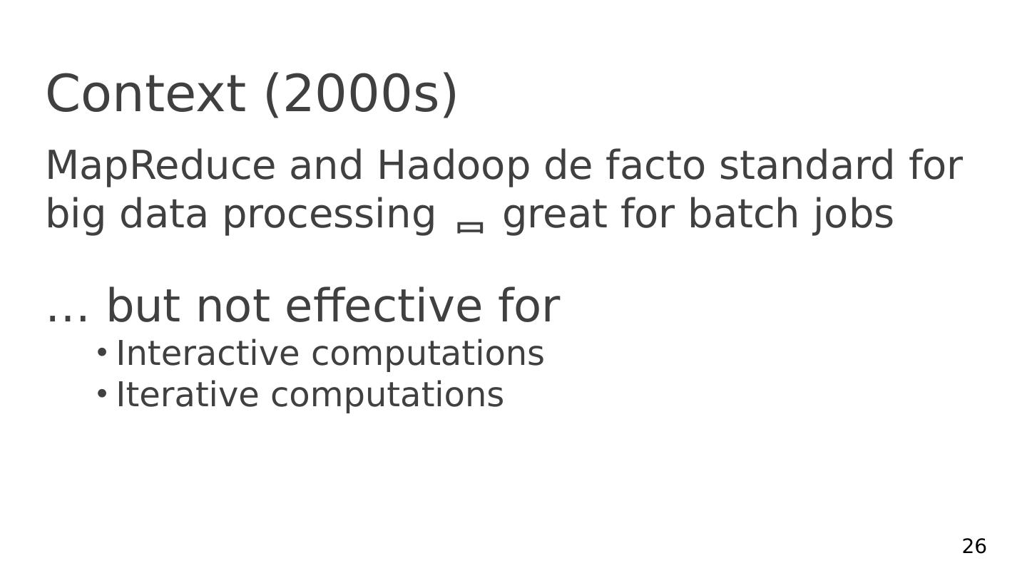 26 .Context (2000s) MapReduce and Hadoop de facto standard for big data processing great for batch jobs … but not effective for Interactive computations Iterative computations 26