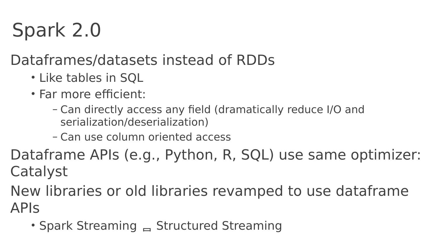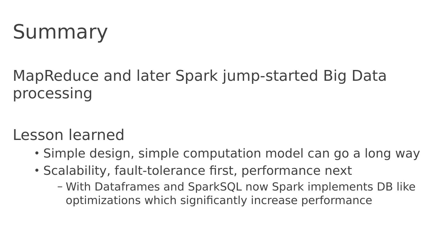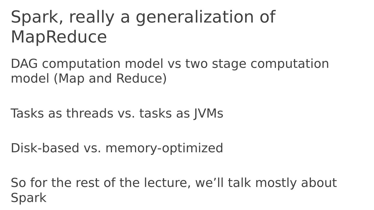 28 .Spark, really a generalization of MapReduce DAG computation model vs two stage computation model (Map and Reduce) Tasks as threads vs. tasks as JVMs Disk-based vs. memory-optimized So for the rest of the lecture, we’ll talk mostly about Spark