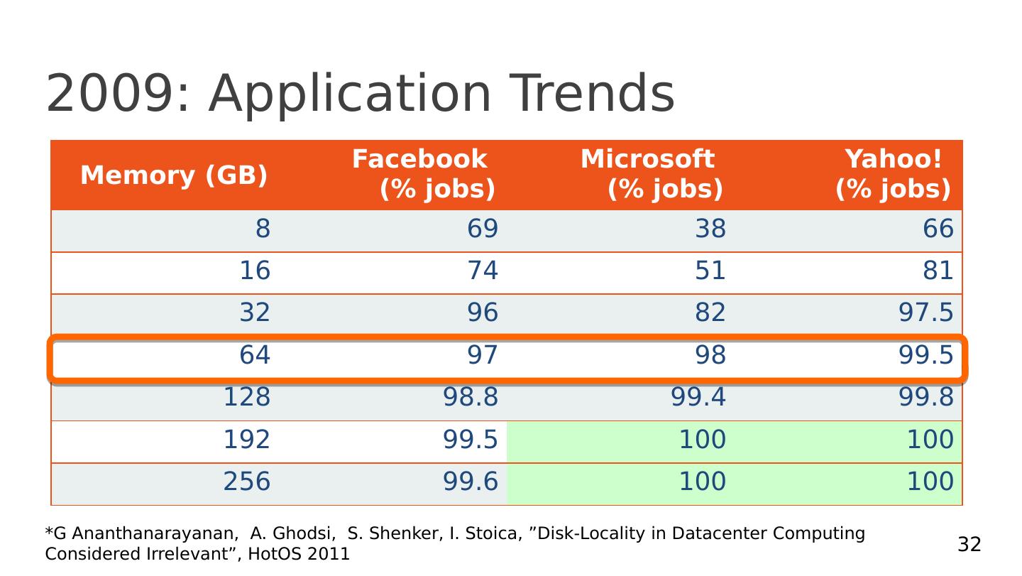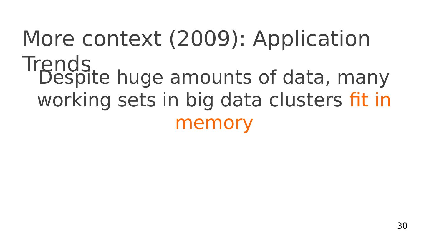 29 .More context (2009): Application Trends Iterative computations , e.g., Machine Learning More and more people aiming to get insights from data Interactive computations , e.g., ad-hoc analytics SQL engines like Hive and Pig drove this trend 29