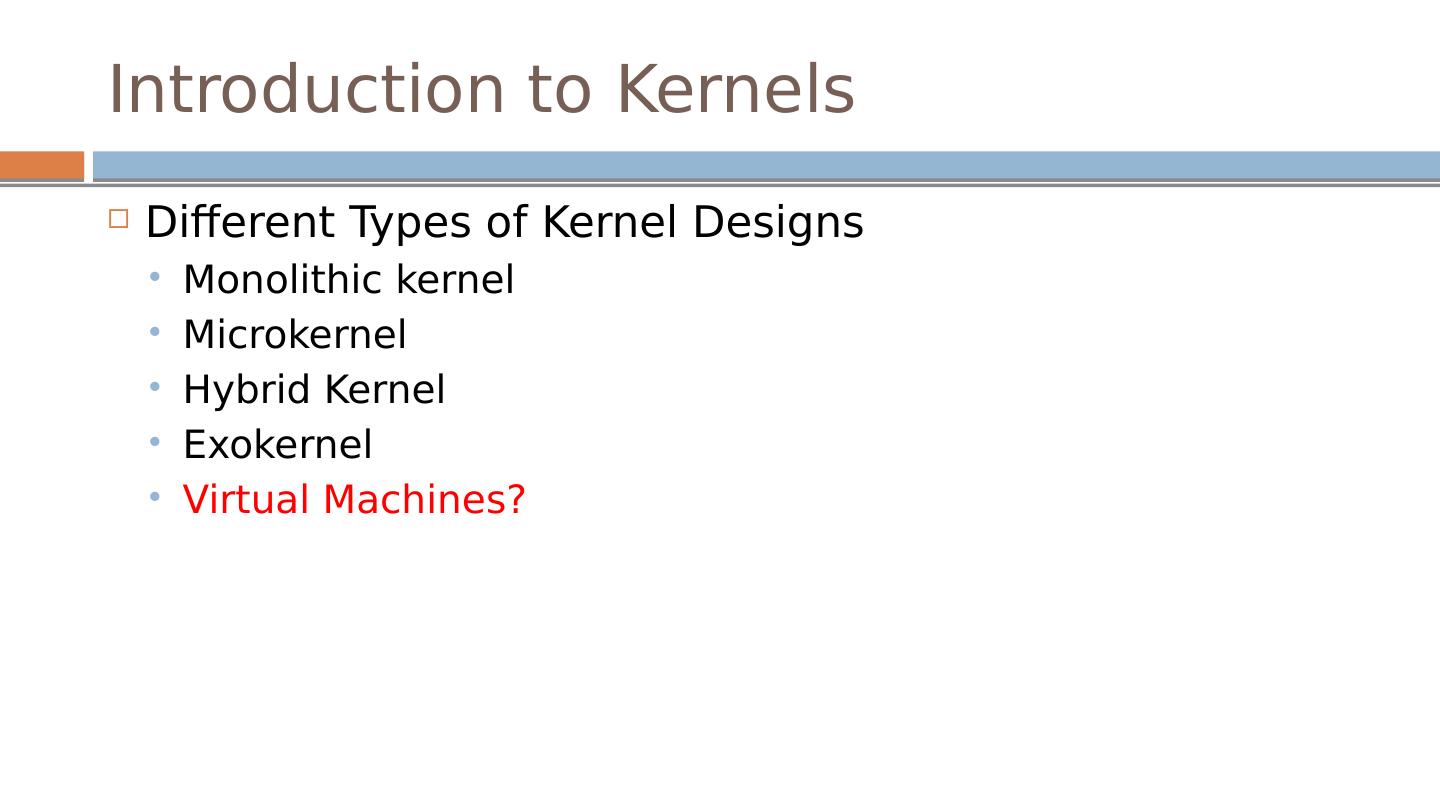 2 .Different Types of Kernel Designs Monolithic kernel Microkernel Hybrid Kernel Exokernel Virtual Machines? Introduction to Kernels