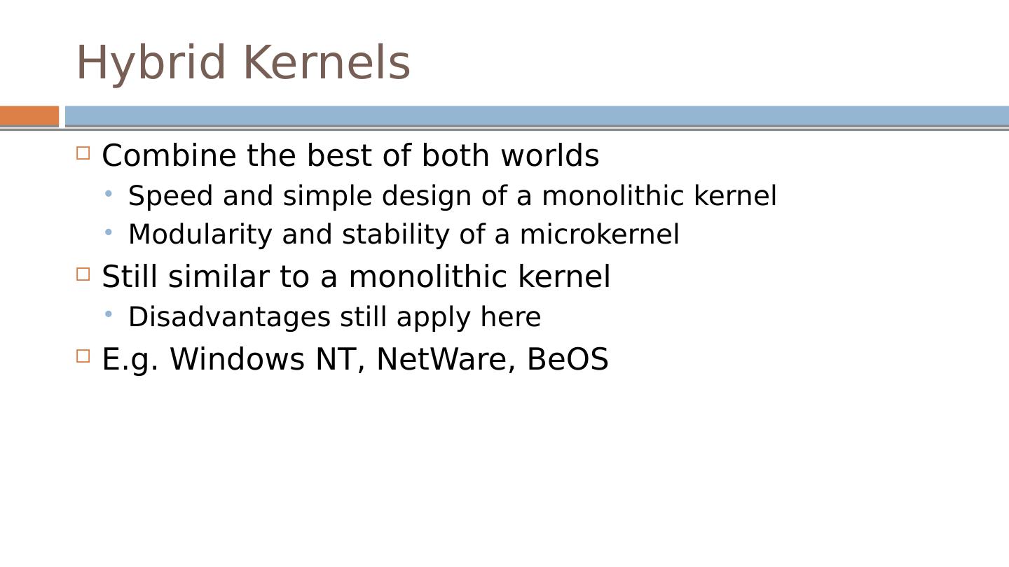 6 .Combine the best of both worlds Speed and simple design of a monolithic kernel Modularity and stability of a microkernel Still similar to a monolithic kernel Disadvantages still apply here E.g. Windows NT, NetWare, BeOS Hybrid Kernels